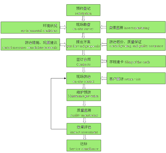 北京环通协力环保技术有限公司——A级资质有害生物防制机构,以诚信、科学、求真、务实的态度与客户密切合作。可提供一次性(赠3个月观察期)和全年制的防制服务,并建立定期的客户回访、质量跟踪、虫情检测制度。家庭服务流程:客户咨询——服务报价——预约时间——上门服务——满意付款——回访调查——维护措施——服务达标单位服务流程:客户咨询——现场勘查——拟定方案——方案确定——签订合同——现场防治——监督回访——质量巩固——服务达标